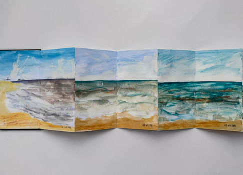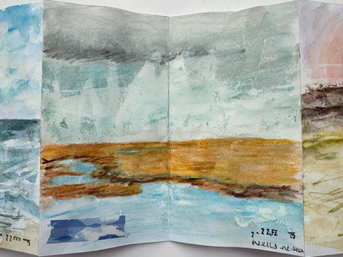 Images from sketchbooks filled over the years including the earliest drawing I can find, completed around 1987, aged 7or 8. There used to be two large posts on Winterton beach with neon red rectangles on top indicating the no swim zone (- rip tides?), the beach and sea bed profile has changed considerably and these were removed years ago, along with the old concrete 'fort' (something to do with WW2?) but I had forgotten they were there until I found this picture. It was drawn during the summer that there was an almost permanent pool between the groynes, topped up by each high tide and warmed daily by the sun - childhood heaven! This lifetime of memories feeds into my response, experience and research about Norfolk.