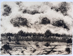 These three monoprints came out of experimenting with imagery researched along the Thames estuary, Thames wetlands and Norfolk Broads to build up a picture of what the Isle of Dogs might have looked like prior to the docks being built. The land is described as being marshy but also used for animal grazing. Big skies and the feeling of being windswept became recurring themes.