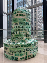 For millennia the River Thames was the main route into and out of London, it is the reason London is both where and what it is. Channel markers had been used for centuries before Henry VIII established Trinity House in 1514 to manage navigational aids in English waters. This is a starboard lateral marker; you leave it on your right as you enter port or head upstream. ‘Welcome’ is printed in letterpress and linocut in languages spoken in Clifford Chance offices around the world. The buoy being placed here in Canary Wharf reflects not just the current nature of global business conducted here but reminds us that this is the site of docks, first opened in 1802, an entry point for both goods and people from around the world.